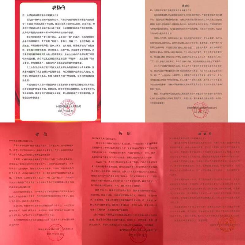 近日,新疆分公司接连收到国网能源哈密煤电有限公司大南湖二矿、国投哈密开发有限责任公司、国能新疆托克逊能源有限责任公司、中煤伊犁能源有限公司发来的贺信和表扬信,信中对新疆分公司高标准、严要求推进各项工作表示衷心感谢,对各项目管理团队主动攻坚克难的奋斗精神予以高度肯定。