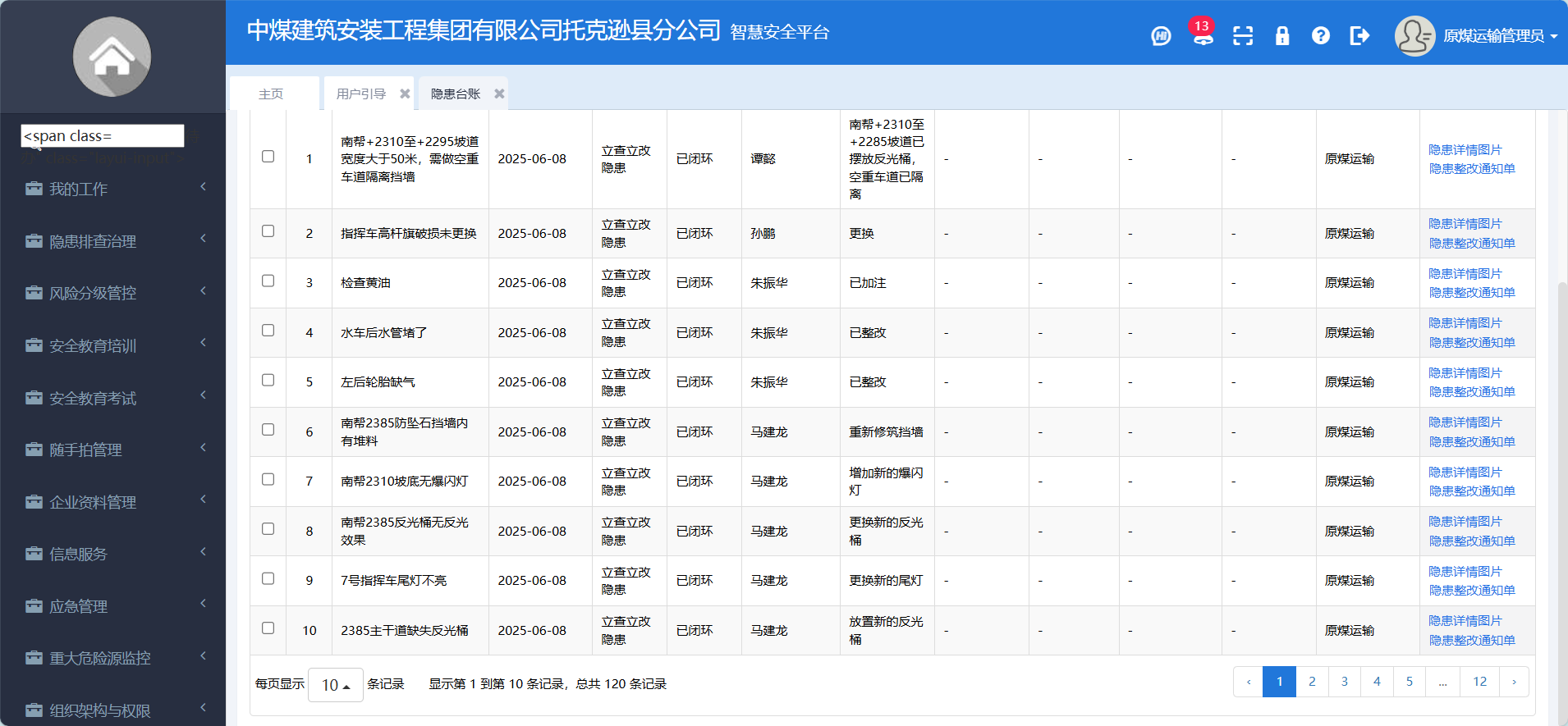 自该平台运行以来,原煤运输项目部共排查各类安全隐患120条,完成闭环120条,整改率达到100%,有效降低安全事故发生,提升安全管理水平。(原煤运输项目部 张伟江)